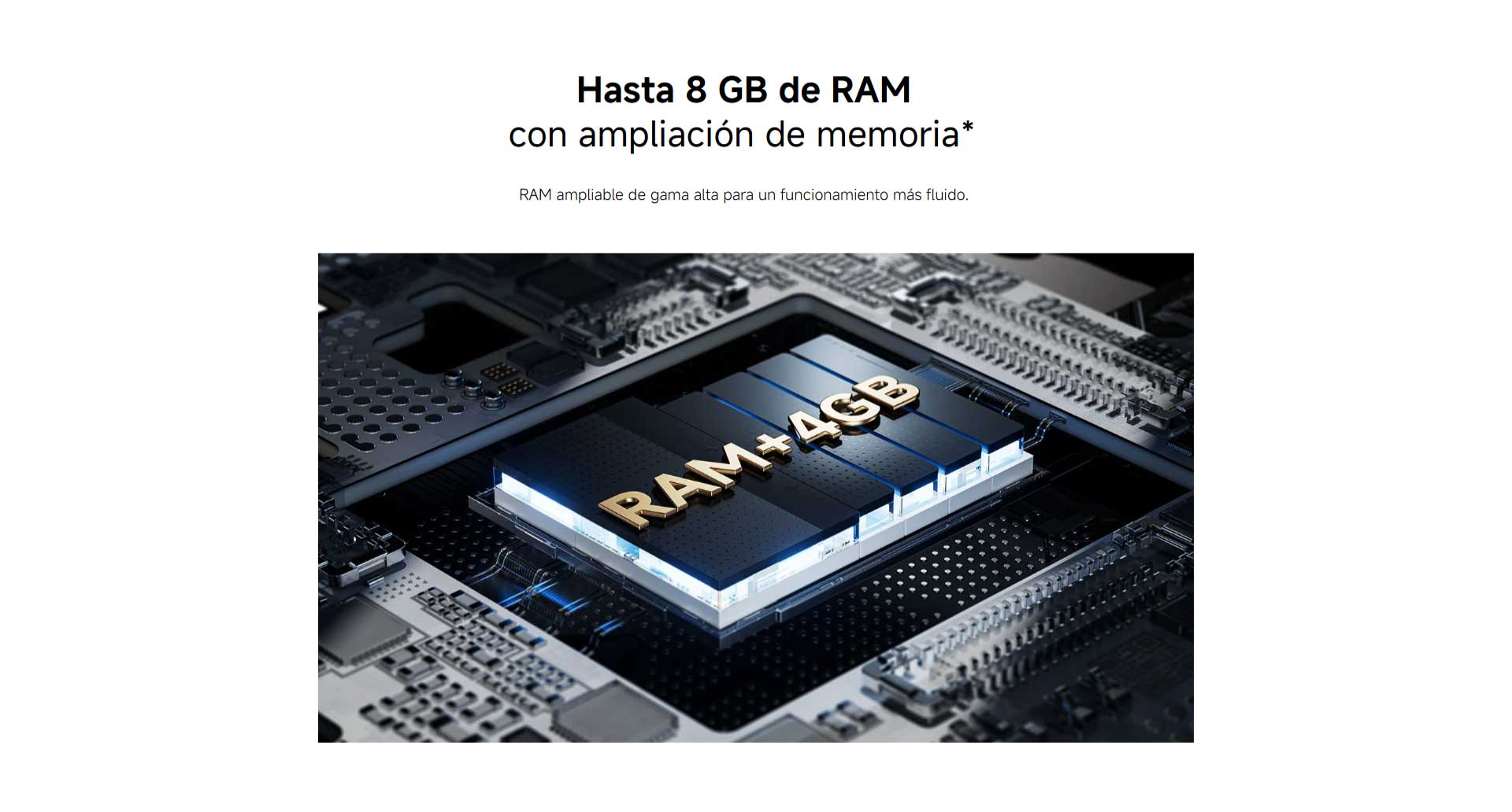 *La RAM de 8 GB con extensión de memoria se basa en la versión de 4 GB de RAM. La RAM adicional ocupará la cantidad correspondiente de almacenamiento de ROM. La extensión de memoria solo está disponible cuando hay suficiente espacio de almacenamiento en el dispositivo. La extensión de la capacidad de almacenamiento de RAM real varía en función del modelo.