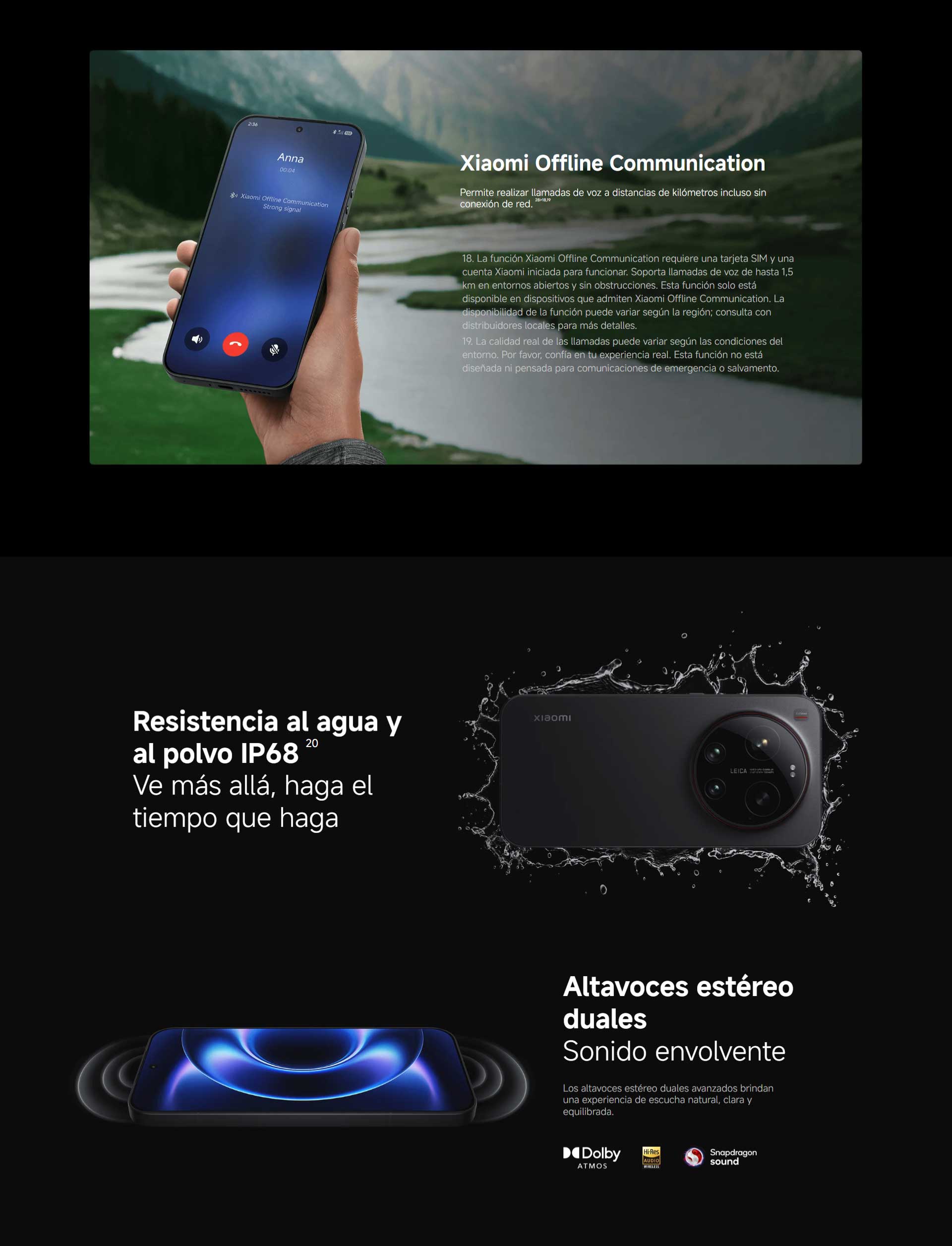*El dispositivo ha sido probado y certificado como resistente a salpicaduras, al agua y al polvo bajo condiciones específicas de laboratorio con la clasificación IP68 de protección de ingreso, conforme a IEC 60529:1989+A1:1999+A2:2013 y EN 60529:1991+A1:2000+A2:2013. Ten en cuenta que las condiciones de prueba de resistencia al agua incluyen: inmersión en agua dulce estática hasta una profundidad de 6 metros, por hasta 30 minutos, con una diferencia de temperatura entre el agua y el producto de 5 °C o menos. Estas características de resistencia al agua solo se aplican a condiciones específicas probadas en un entorno de laboratorio, que no corresponden a las condiciones normales de uso por parte del consumidor. Por lo tanto, no se garantiza la protección contra el ingreso si el producto se expone fuera de dichas condiciones de prueba. Te recomendamos que no lo pruebes por tu cuenta. No se aconseja su uso en la playa o piscina. La protección contra el ingreso puede verse afectada por el desgaste diario, daños físicos y/o el desmontaje necesario en caso de reparación. Evita cargar el producto, presionar los botones físicos o extraer la bandeja SIM cuando el producto esté expuesto a la humedad. Consulta cuidadosamente el manual de usuario para conocer otras instrucciones de seguridad. La garantía no cubrirá los daños por líquido causados en entornos que excedan las condiciones de prueba IP68.